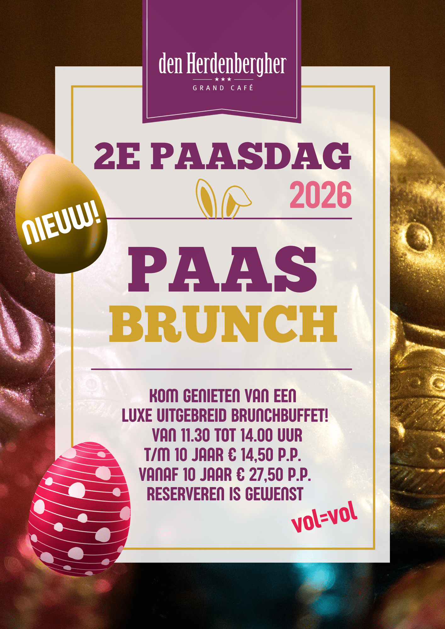 Vier het voorjaar en geniet samen van een gezellige Paasbrunch bij Den Herdenbergher! Op Tweede Paasdag (maandag 6 april 2026) zetten wij een uitgebreid buffet voor je klaar, vol heerlijke seizoensproducten, warme gerechten en zoete lekkernijen.