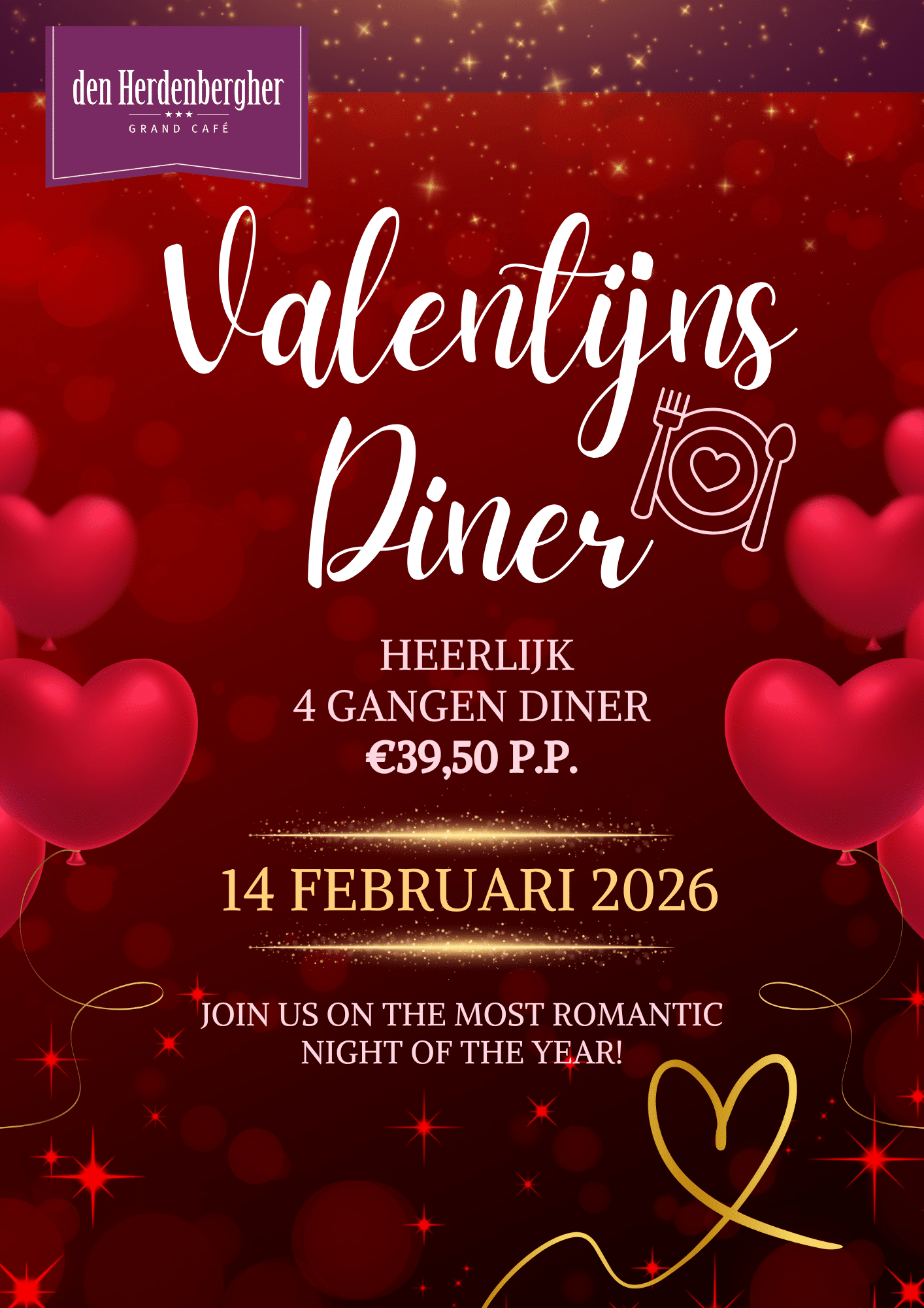 Samen genieten van een avond vol smaak en aandacht voor elkaar. Op Valentijnsdag serveren wij bij Den Herdenbergher een heerlijk 4-gangen diner, speciaal samengesteld om van elk moment samen iets bijzonders te maken.